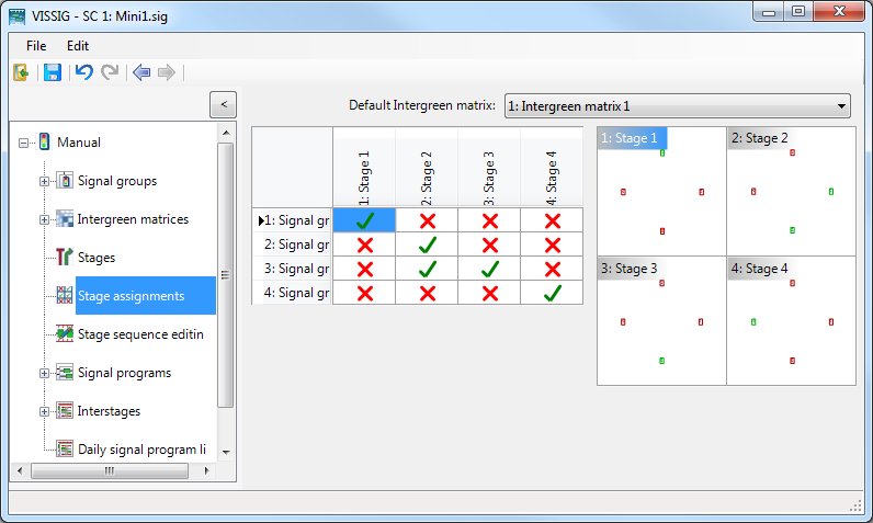 デフォルトでは、選択された青信号の間隔マトリックスが、[Intergreen matrices]-[青信号の間隔マトリックス] の概要テーブルにおいて「x」でマーキングされています。