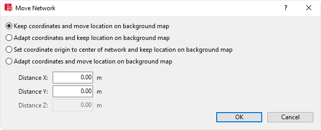 ネットワークも地図の基準ポイントも移動しないため、距離は変更できません。ネットワークを遠くまで移動しすぎた場合、ネットワークの基準ポイントの現在の座標値が大きすぎる場合、座標値を0.000,0.000に設定したい場合などに、このオプションを選択します。 |