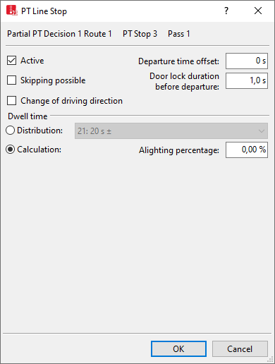 [Departure time offset:]-[出発時間オフセット:]:タイムテーブルに応じて、出発時間を定義します。時間オフセットは、乗車時間と降車時間にも使用されます(乗車/降車)。出発時間は次のように計算されます。 到着のシミュレーション秒 + 停止時間 + 最大値 (0, ((公共交通路線の出発時間 + 出発オフセット) - (到着のシミュレーション秒 + 停止時間)) • 公共交通路線のスラック時間比率) 特定の時点(到着時間と停止時間の合計)からタイムテーブルの出発時間まで間がある場合は、スラック時間比率が1であれば、タイムテーブルに応じて公共交通車両は出発時間まで待機します。スラック時間比率が1未満の場合は、それに応じて、値の幅0.00~1.00で車両は出発を早めます。 路線の [Slack time fraction]-[スラック時間比率] が0.00の場合、そのタイムテーブルは考慮されません。この場合は、停止時間の幅の設定が、 [Dwell time]-[停止時間]の計算で考慮されます。公共交通路線の [time offset]-[オフセット時間] 属性が1以上の場合、タイムテーブルが考慮されます。 公共交通の部分的ルートの路線停留所の場合は、次が適用されます。