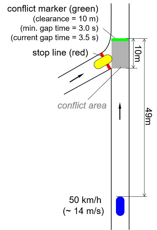 次の図では、主要道路の左側の青色の車両が50 km/h(約14 m/s)の速度で走行しており、交錯マーカーの49 m上流にいます。現在のタイムギャップは [49 m / 14 m/s = 3.5 sec]-[49m÷14m/s=3.5秒] です。最小ギャップ時間は3.0秒なので、下の黄色の車両は側道から進入できます。
