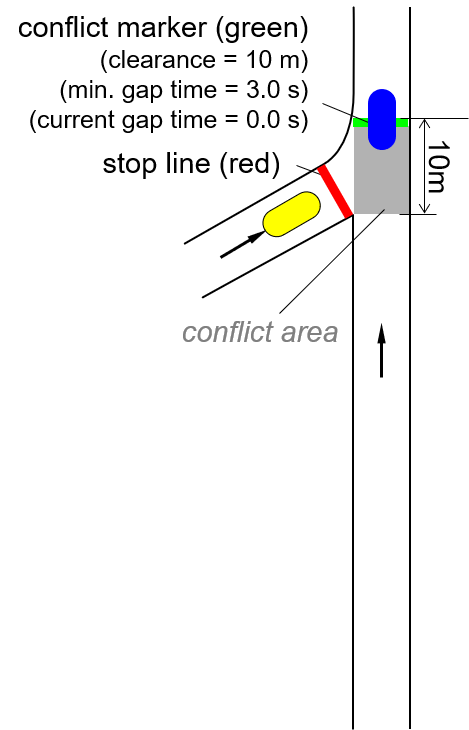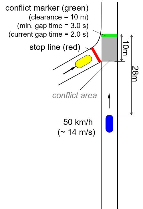 次の図では、青色の車両は交錯中マーカーから28 mの位置にいます。現在の時間ギャップは [28 m / 14 m/s = 2 s]-[28m÷14m/s=2秒] です。最小ギャップ時間は3.0秒なので、黄色の車両は待たなければなりません。