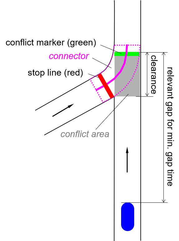 [Clearance]-[最小車頭距離]:この間隔は、競合中マーカー(緑色の線)から移動方向と逆向きに進んで、交錯マーカーに向かって来る最初の車両までの距離を示します。車両がまだ交錯マーカー内にある場合は、クリアランス = 0になります。