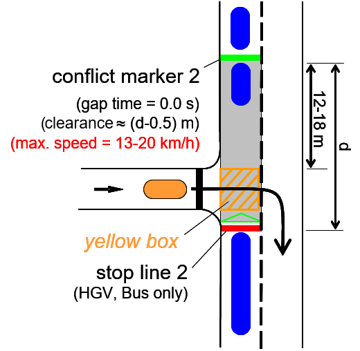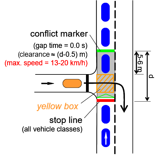 3. 最小クリアランスは、少なくとも停止線と交錯マーカー(青のバー)の間の距離でなければなりません。これにより、別の車両が黄色の斜線の交錯エリアにいる間は、そのエリアに車両が進入しないようにします。