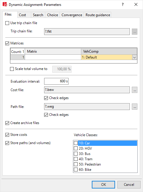 旅行時間と交通量がコストファイルに保存される特定の[Vehicle classes]-[車両クラス]を選択することができます。これらの車両クラス固有データには、エッジ属性および経路属性 [Travel time (old)]-[旅行時間(旧)]、[Travel time (new)]-[旅行時間(新)]、[Volume (old)]-[交通量(旧)] および [Volume (new)]-[交通量(新)]経由でアクセスできます。その後、サブ属性 [Time interval]-[時間間隔] および [Vehicle Class]-[車両クラス] を選択します。サブ属性 [Vehicle Class]-[車両クラス] は、ここで選択された車両クラスをベースとしています。選択された車両クラスに配分された車両タイプの各車両ごとに、経路検索と経路選択に車両クラス固有の値が使用されます。オプション [交通量使用(旧)]([Choice]-[選択] タブ)と組み合わせると、*.anmroutesファイル(PTV Visumからエクスポートされたものなど)のクラスに依存しない配分結果を、確率的偏差のみで再現することができます。 旅行時間は、[Cost]-[コスト] タブで選択された [smoothing method]-[平滑化メソッド] に基づいて平滑化されます。 |