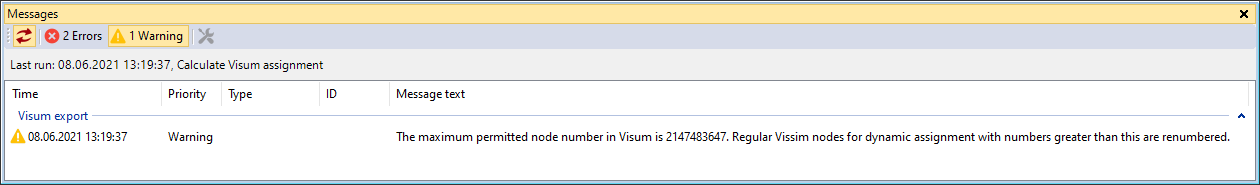 Vissimネットワークに、Visumで使用できる最大ノード数(2,147,483,647)を超える数のノードがある場合、配分を計算できません。[PTV Visum Export]-[PTV Visumエクスポート]ウィンドウが開きます。