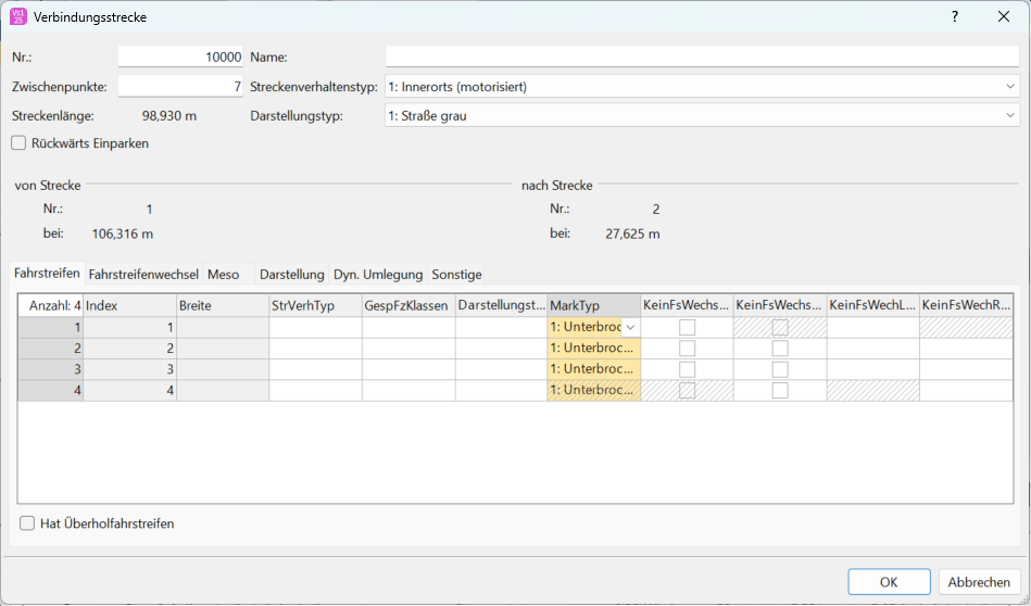 Die Attribute der Verbindungsstrecke für die mesoskopische Simulation entsprechen denen von Strecken (Attribute von Strecken).