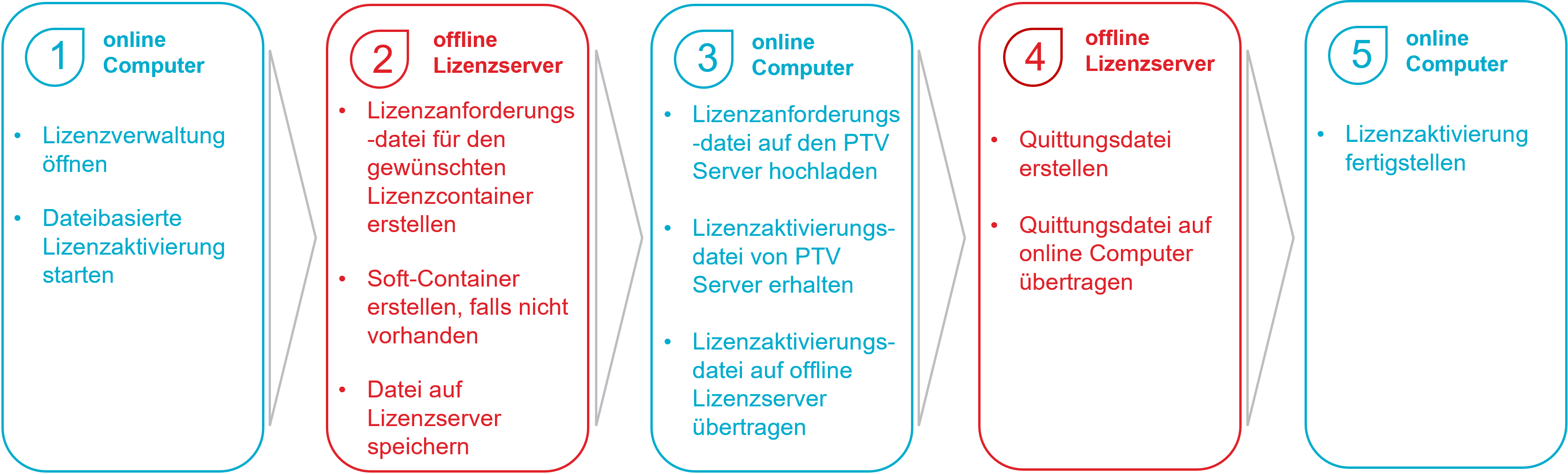 In der folgenden Grafik sehen Sie zusammengefasst den Ablauf der dateibasierten Lizenzaktivierung unterschieden nach Lizenzserver ohne Internet (rot) und Computer mit Internetverbindung (blau).