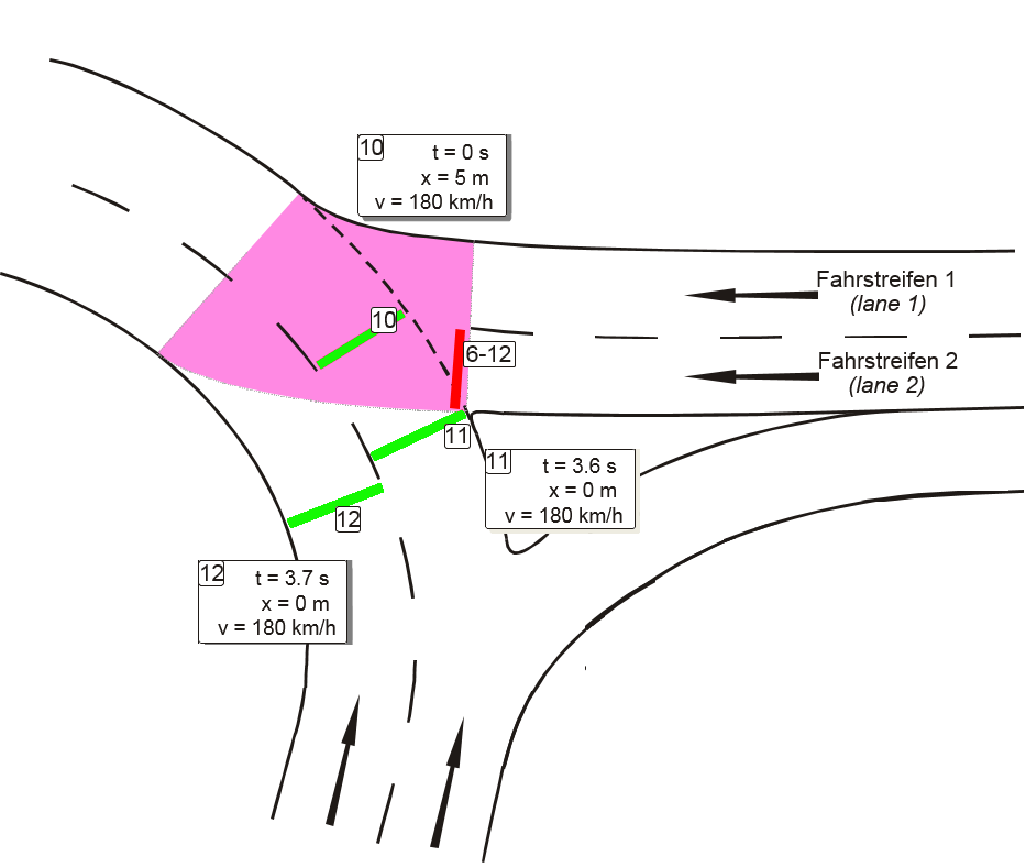 So far, all priority rules have applied for all vehicle classes. When long vehicles on the roundabout cross the conflict area, it is not enough to take of the vehicles that are slower than 14 km/h. To prevent vehicles entering the roundabout from laterally colliding with an HGV, an additional priority rule (No. 4) has to be positioned at the same point as rules 1-3. This priority rule must account for long, obstructive vehicles only. In our example these are HGV and buses.