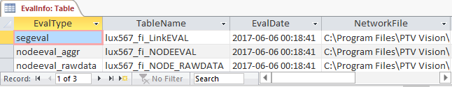 The database file is saved. A table EvalInfo is created for the evaluations in the database. The table contains the evaluations with the user-defined name of the table in the Table name column. If you wish to execute multiple simulation runs, the data from the simulation runs is saved only in a database table. In the attribute list, multiple columns with the same title name are merged to one column.