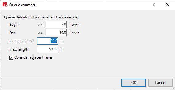 Define queue condition: A vehicle is in queue if its speed is less than the value v < that was entered for the Begin. |