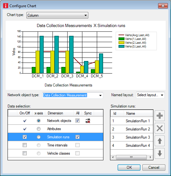 Next you can limit the selected objects and attributes to the desired simulation runs, time intervals, vehicle classes or pedestrian classes. You can only select these if the selected network object type, base data type or result data type has attributes related to the desired dimension.