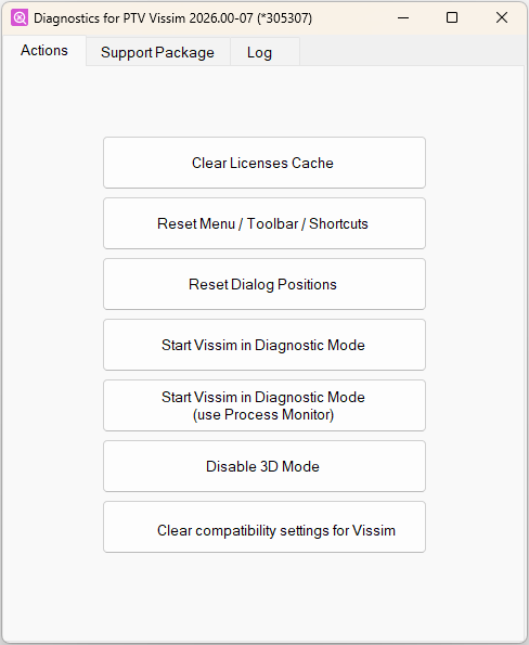 The window Diagnostics for Vissim 2026 opens. The Actions tab is shown by default.