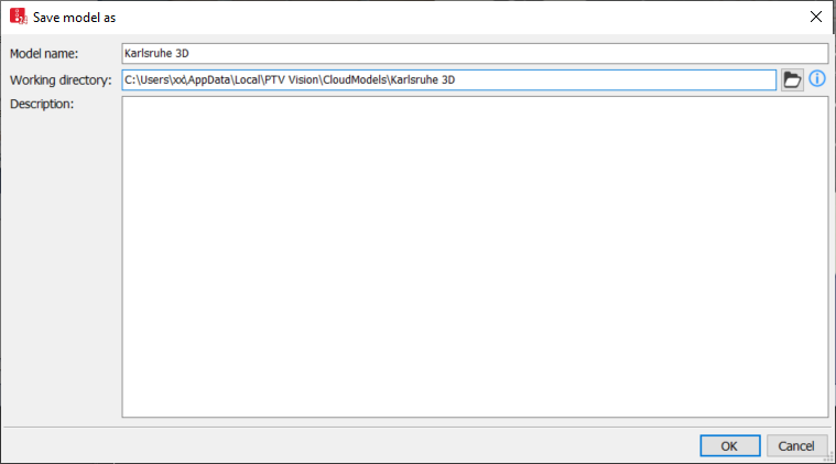 You can store the opened Vissim network and associated files as a cloud model on a cloud server. You can enter a new name for the cloud model. This way you can also upload an open cloud model to PTV Hub.