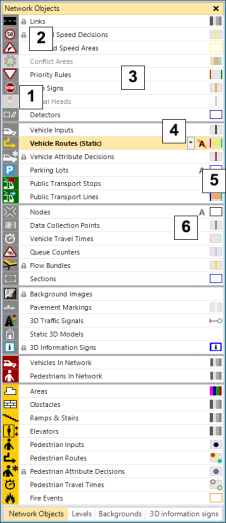 The network object sidebar contains a list with the network object types. In a network editor, you can use buttons and the shortcut menu to access functions for the display, selection, and editing of network objects. Your settings are only active in the last network editor used. If you click another network editor to activate it, in the network object sidebar, the settings for this network editor are displayed.