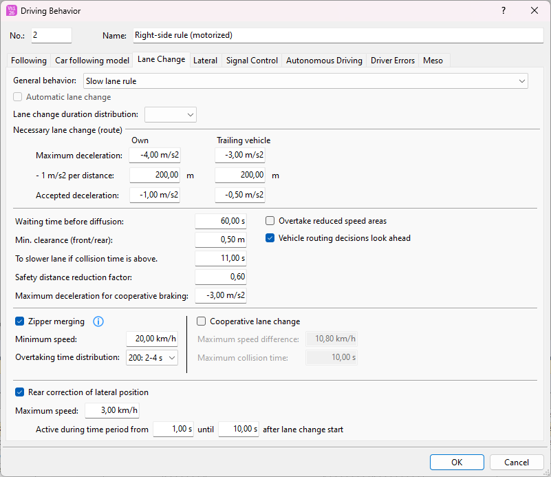 Regardless of the option selected, you can model the general behavior more realistically using the settings under Cooperative lane change. |