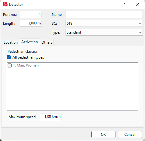 A detector defined for a link with the attribute Is pedestrian area is used to model pedestrians pressing a crosswalk button. Here pedestrian classes are displayed.