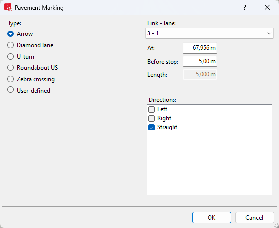 The Pavement Marking window opens automatically when you insert a network object and have selected to automatically open the Edit dialog after object creation (Right-click behavior and action after creating an object). By default, only the Pavement Markings list is opened.
