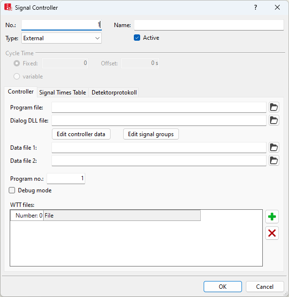 ProgNo: The signal program which is to be simulated. The signal program number can be specified for a signal controller of type External. This is also possible during the simulation run. |