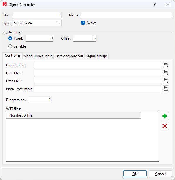 ProgFile *.dll file: Program file of the control logic for more modern Siemens control units that you want to use to control the intersection. In addition, in the Node Executable box. choose an *.exe file. This is the file *.exe: the program file of the control logic for older Siemens control units, with which the nodes are to be controlled. |
