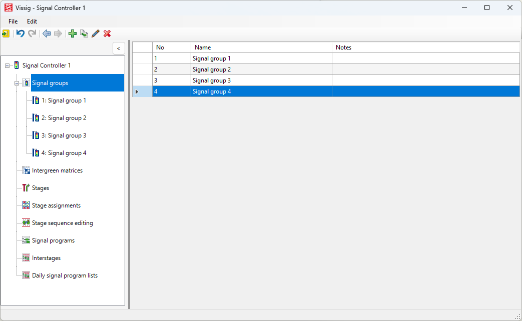 For signal control procedures of the type Siemens VA, TRENDS, VAP and VS Plus, you do not define signal groups in the signal controller editor (Defining signal groups for Siemens VA, VAP, VS-Plus).