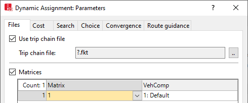 The trip chain file is displayed. You can edit the attributes of the dynamic assignment (Attributes for the trip chain file, matrices, path file and cost file).