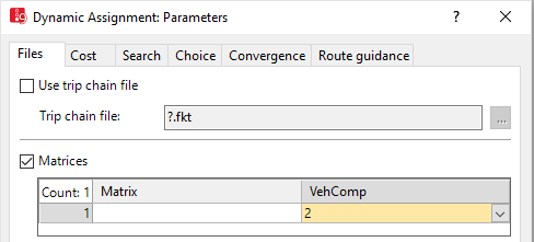 You can edit additional attributes of dynamic assignment (Attributes for the trip chain file, matrices, path file and cost file).