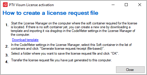 6. Continue with Creating a license request file step (Click the Download template hyperlink and save the file to the license server.).
