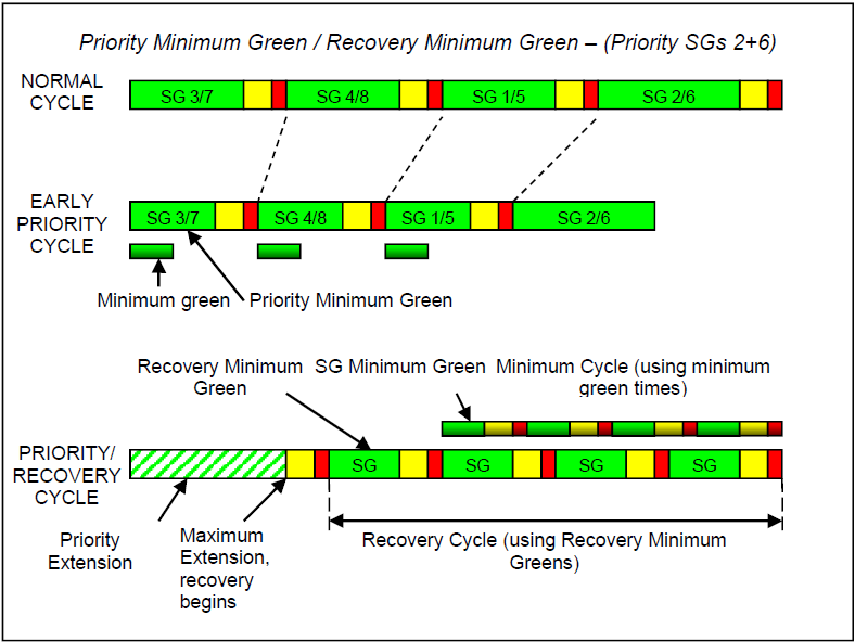 When computing the maximum duration for a priority extension, the controller will take into account the minimum timing for each signal group in the recovery cycle (the cycle following the priority extension). The controller can only extend the Priority SGs to the point where it can still serve the greater of the Min Green time or recovery minimum green time to all subsequent signal groups by the end of the next cycle.