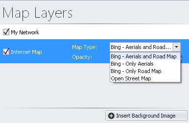Vistro includes a fully licensed internet feed from Bing™ that includes satellite aerial images and map labels. You can toggle these on and off using the My Network, Labels and Aerial Images selector (see section Network Window Network Window). These maps assist with orientation, network drawing and display.