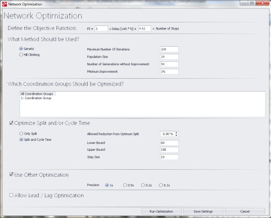 - Go to the Signal Control > Network Optimization in the Menu Bar to access the Network Optimization Dialog:
