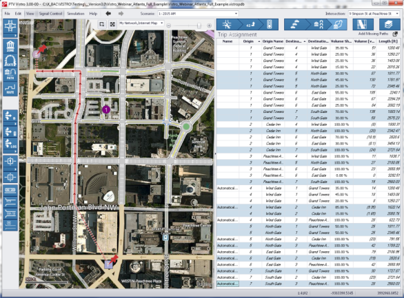 When a row is selected in the Trip Assignment Workflow Table, the corresponding path is displayed visually in the network window, see the figure below: