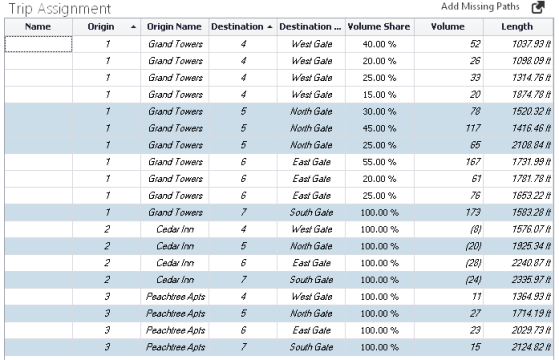 After the Trip Generation and Trip Distribution have been defined, you can assign your development trips to the network in the Trip Assignment step. Here, you define the allocation of the shares of trips to take specific paths between each zone and gate / zone and zone pair. Figure 27: Trip Assignment Table shows the interface: