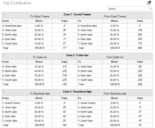 If you have the same distribution for trips entering the Zone as leaving the Zone, you can input the share % for either the To or From and mirror that distribution for the other direction by using the left and right arrows in the header of each sub-table. |