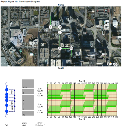 Time space diagrams figures are also reported. The route is displayed visually in the top half of the figure, and the time space diagram is depicted in the bottom half of the figure, either as flowing off or arterial bands:
