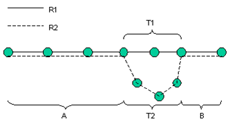 La recherche d’alternatives d’itinéraires par variation stochastique des temps généralisés s’apparente à d’autres procédures de détermination des chemins les plus courts et présente l’inconvénient commun que les nouveaux itinéraires déterminés ne se distinguent souvent que très peu des itinéraires précédents. De tels itinéraires sont indésirables dans la mesure où ils ne modifient guère l’état de charge du réseau et ne font qu’augmenter la quantité d’itinéraires, ce qui peut prolonger le temps de calcul et augmenter l’espace mémoire requis. Pour cette raison, un test de détour est proposé dans le cadre de l’affectation stochastique, qui écarte un itinéraire R2 s’il existe déjà un itinéraire R1 coïncidant avec R2 sauf sur une section et que cette section est beaucoup plus longue dans R2 que dans R1. Plus précisément, R2 est écarté au profit de R1 lorsque l’approche suivante s’applique (Illustration 109) :