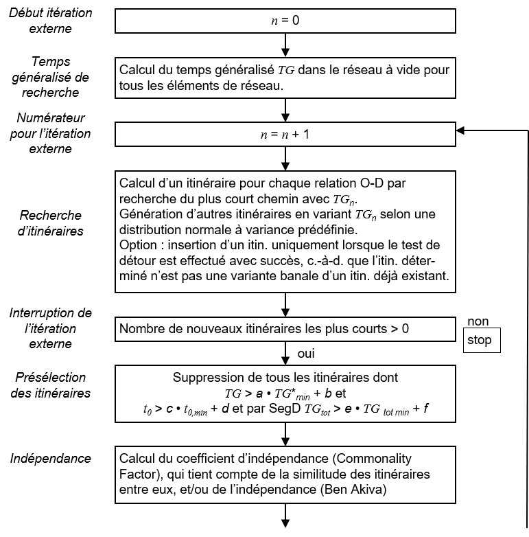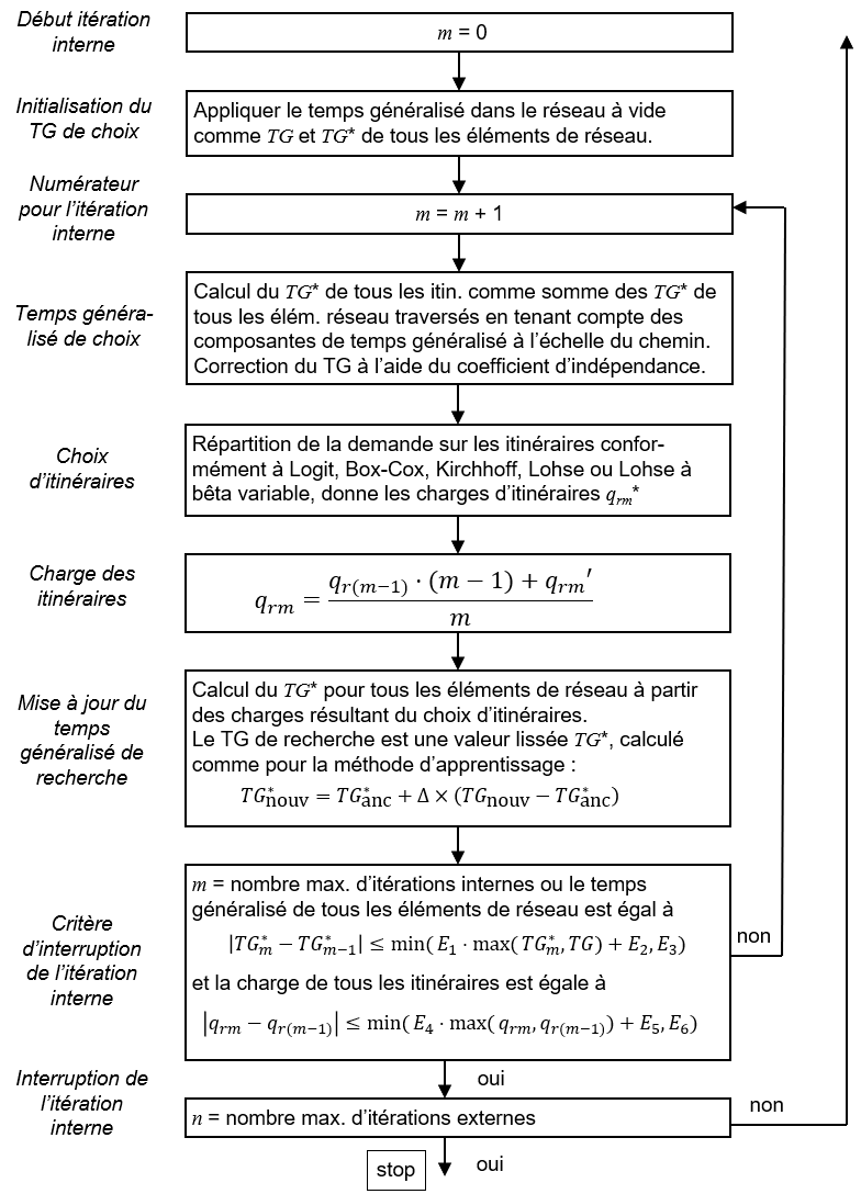- L’itération interne avec l’itérateur m sert à la répartition de la charge sur les itinéraires. Cette boucle est répétée soit jusqu’à ce que m = M soit jusqu’à ce que les écarts des temps généralisés des éléments de réseau et l’écart des charges sur les itinéraires entre deux étapes d’itération deviennent très faibles.