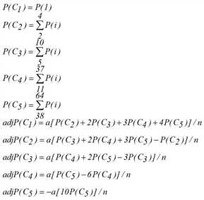 Après le calcul de P(i) pour chaque cas (i), il faut calculer un ajustement pour chaque cas DOC. L’ajustement tient compte d’une corrélation en série dans le calcul précédent en raison des cas conflictuels apparentés. Les équations d’ajustement par cas DOC (Ck) sont les suivantes :