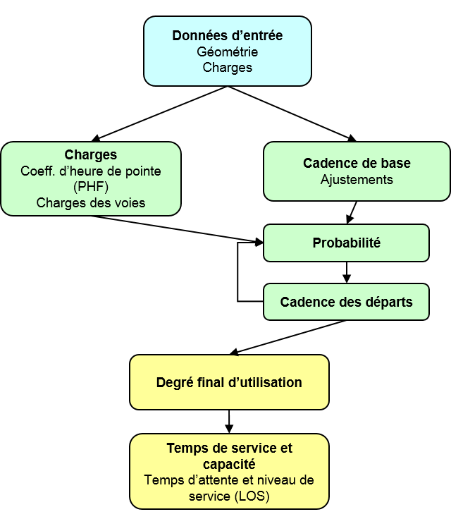 Le calcul fondamental est représenté dans le diagramme prévisionnel dans l’Illustration 71. Vous spécifiez la géométrie du carrefour et les charges en plus d’autres attributs tels que le coefficient d’heure de pointe PHF et le pourcentage de poids lourds. Les charges sont ajustées et assignées aux voies. La prochaine étape est le calcul des coefficients d’ajustement pour les cadences de saturation (de capacité). Les cadences de départs (c.-à-d. le temps moyen entre deux départs sur une voie d’une voie d’accès) sont alors calculées sur la base de toutes les combinaisons de probabilités. Ces cadences de départ de chaque voie de chaque voie d’accès dépendent des autres voies d’accès et sont donc calculées de manière itérative. Lorsqu’une valeur convergée est déterminée, on peut calculer le temps de service, le temps d’attente moyen et le niveau de service (LOS).