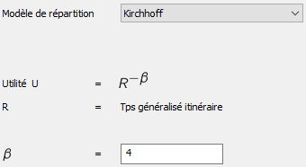 La somme pour l’ensemble des itinéraires j est calculée et β sert de paramètre exprimant la sensibilité des usagers aux temps généralisés élevés. Dans cette méthode de répartition, on se sert des proportions des différents temps généralisés pour la répartition. Ainsi, il n’y a pas de différence dans la répartition entre des itinéraires avec des temps généralisés de 5 et de 10 minutes et d’autres itinéraires avec des temps généralisés de 50 et de 100 minutes. L’Illustration 88 montre la configuration des paramètres du modèle de répartition de Kirchhoff dans l’interface utilisateur.