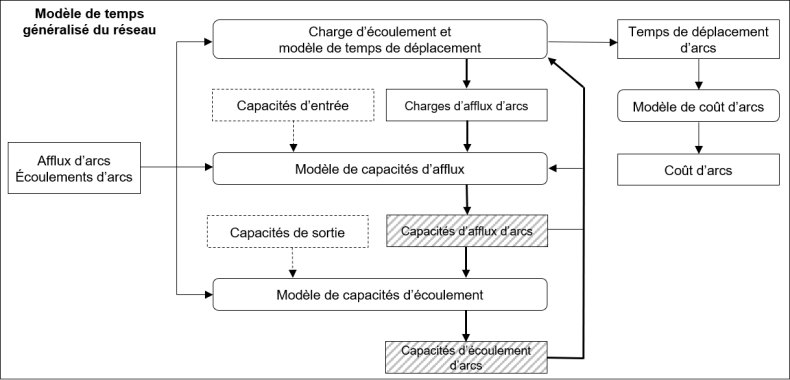 Le modèle de temps généralisé du réseau se compose de trois sous-modèles interdépendants, le « modèle de temps d’écoulement et de temps de déplacement pour les capacités variables dans le temps », le « modèle de capacités d’afflux » et le « modèle de capacités d’écoulement », calculé de manière itérative. L’Illustration 129 montre les trois modèles dans le contexte. Les temps de déplacement découlant des trois composantes du modèle avec retour d’informations en tant que solution sont regroupés avec le coût monétaire dans un coût généralisé au moyen d’un modèle de coût d’arcs.