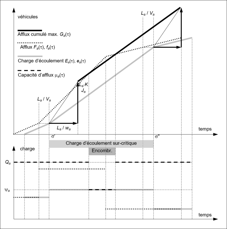 Dans les diagrammes fondamentaux utilisés, la branche surcritique est linéaire et ua(τ) est donc réversible. Dans la mesure où wa(q) = wa, le temps pour ua(τ) = τ, en s’appuyant sur [43], σ = τ - La /wa. De plus, on a Ha(τ) = Ea(τ) + La • KJa, en s’appuyant sur [44], q/va(q) = KJa - q/wa. Ainsi, l’afflux maximal cumulé Ga(τ), qui aurait pu s’engager sur l’arc à l’instant t conformément à la charge d’afflux, résulte de l’équation suivante :