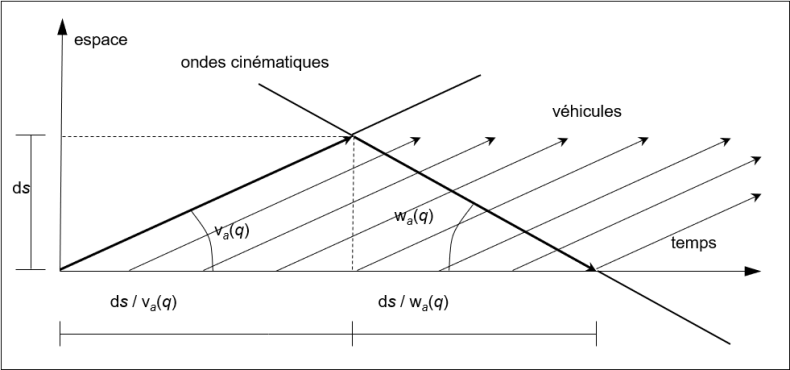 Par définition, les points dans le temps et l’espace qui constituent les trajectoires en ligne droite générées par une onde de congestion sont caractérisés par le même état de charge. En outre, l’Illustration 134 montre que le nombre de véhicules rencontré par l’onde surcritique relatif à la charge d’écoulement q pour une distance infinitésimale ds parcourue en sens inverse correspond à l’intervalle de temps ds