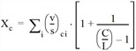 L’équation consiste fondamentalement en un pourcentage du temps pendant lequel les tourne-à-gauche peuvent tourner multiplié par un coefficient d’ajustement. Le coefficient d’ajustement est basé sur la part des tourne-à-gauche dans le groupe de voies et sur un coefficient équivalent pour le temps d’acceptation d’intervalles véhicule qui repose sur le volume de la circulation antagoniste. Le calcul du pourcentage du temps pendant lequel les tourne-à-gauche peuvent tourner est une fonction du volume de la circulation antagoniste et de son temps de vert. L’équation est la suivante.