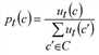 Chaque liaison c de C présente un temps généralisé wt(c) qui dépend de t pour chaque intervalle de temps t de T, car le temps généralisé peut inclure la différence entre l’intervalle de temps et le départ de la liaison. L’utilité correspondante ut(c) est calculée à partir du temps généralisé wt(c) à l’aide d’une fonction d’utilité f antitone d’après ut(c) = f (wt(c)). Dans le modèle Logit, on a f(x) = e-bx. La part de la demande de l’intervalle t revenant à une liaison c est alors déterminée selon la formule suivante.