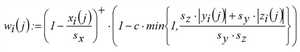 Le premier facteur modélise la proximité temporelle de i et j. En cas de temps identique, xi(j) = 0, de sorte que ce facteur a en tout la valeur 1. Lorsque pour la différence temporelle, xi(j) ≥ sx, le terme est par contre nul et par conséquent wi(j) = 0. La valeur sx est donc l’écart temporel maximal permettant une influence de j sur i.