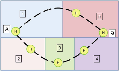 La sommation des tarifs de chemins partiels dans le temps généralisé dans l’exemple 2 correspond à la situation dans laquelle il faut acquérir un nouveau titre de transport pour chaque chemin partiel. Si le tarif repose toutefois sur un autre système de tarification dans la réalité (parce que le voyageur peut effectuer son trajet avec un seul titre de transport), une imprécision en découle ici. On peut la compenser par des « remises de correspondance » : utilisez la fonction Tarifs de correspondance dans le modèle de tarification Visum pour définir des remises pour les changements de système de transport qui compensent le tarif calculé en trop. Dans cet exemple, il faudrait définir un tarif de correspondance de 5 UM - 8 UM = -3 UM pour corriger le tarif appliqué dans le temps généralisé.