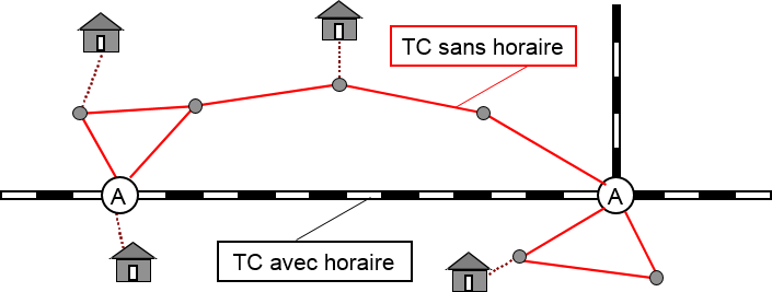 - Les zones qui ne sont pas directement desservies par le réseau principal sont tout de même reliées à des arrêts du réseau principal par l’intermédiaire de longs connecteurs. Cette alternative vous oblige à estimer correctement le choix d’itinéraires dans le réseau subordonné lors de la sélection des connecteurs et de la spécification de leurs attributs. Le choix d’itinéraires peut également varier en raison de modifications de l’offre dans le réseau principal.