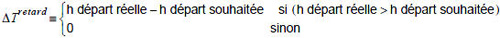 - ∆Tairetard = temps de retard du départ de la liaison i par rapport à l’heure de départ souhaitée pour l’intervalle a (→ courbe de distribution) ; égal à 0 si le départ i se situe dans l’intervalle a ou avant l’intervalle a.
