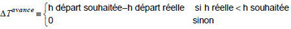 - ∆Taiavance = temps d’avance du départ de la liaison i par rapport à l’heure de départ souhaitée pour l’intervalle a (→ courbe de distribution) ; égal à 0 si le départ i se situe dans l’intervalle a ou après l’intervalle a.