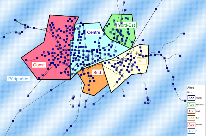 Vous pouvez calculer des indicateurs selon les aires telles que les zones de zones tarifaires, les quartiers, les communes ou les cantons à l’aide d’évaluations relatives aux aires. L’élément déterminant pour le calcul est le polygone de délimitation de l’aire et la part de l’indicateur revenant au polygone (Aires). Le réseau exemple de Karlsruhe contient six aires (Illustration 183). Dans l’exemple, celles-ci correspondent aux zones tarifaires TC existant dans le modèle de tarification Visum. Cela signifie que les polygones (limites d’aires) ont été modélisés de manière à inclure exactement les arrêts de zones tarifaires TC correspondantes. Chaque zone tarifaire TC correspond donc exactement à une aire et les indicateurs peuvent être calculés selon une zone tarifaire. Quelques exemples d’analyses selon les aires possibles sont présentés ci-après.